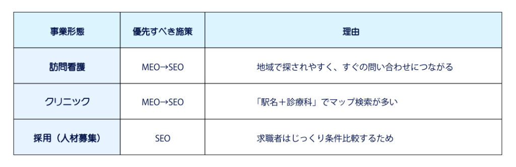 - MEO:すぐに施設を探している人(例:「訪問看護 大阪」「クリニック 渋谷」)